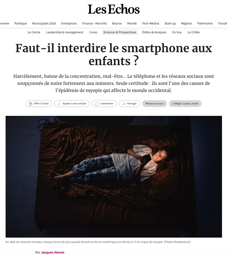 J’ai publié hier matin dans le quotidien Les Echos une enquête sur les conséquences de l’usage abusif que font du smartphone et des réseaux sociaux beaucoup de pré-ados et d’ados. Un problème qui concerne aussi bien les parents français que les familles anglaises, australiennes ou Californiennes : dans l’Hexagone, 42 % des 12-17 ans passent entre 2 et 5 heures sur leur smartphone, 9% d’entre eux y consacrent même plus de 5 heures par jour (source : Crédoc Baromètre du numérique – Edition 2025). Si – faute de pouvoir accéder aux données des Instagram, TikTok et autres Snapchat -, il y a encore débat scientifique sur l’impact des réseaux sociaux sur la santé mentale des jeunes, il n’y a pas photo pour leurs yeux : « La myopie évolutive chez les enfants est de plus en plus fréquente en raison d’un manque d’exposition au soleil et d’une augmentation du temps passé à regarder de près : plus les enfants vivent en ville, où ils sont moins à l’extérieur, et sont soumis à la pression scolaire qui les oblige à étudier intensément sur des livres ou des écrans, plus ils sont susceptibles de devenir myopes », résume Annegret Dahlmann-Noor, spécialiste de la myopie au Moorfields Biomedical Research Centre, à Londres. « Ce à quoi il faut ajouter les endormissements plus tardifs qui perturbent le cycle du sommeil et donc de la production de mélatonine et de dopamine, ce qui aggrave les myopies », précise Dominique Bremond-Gignac, chef du service d’ophtalmologie de l’hôpital universitaire Necker Enfants malades de l’APHP.