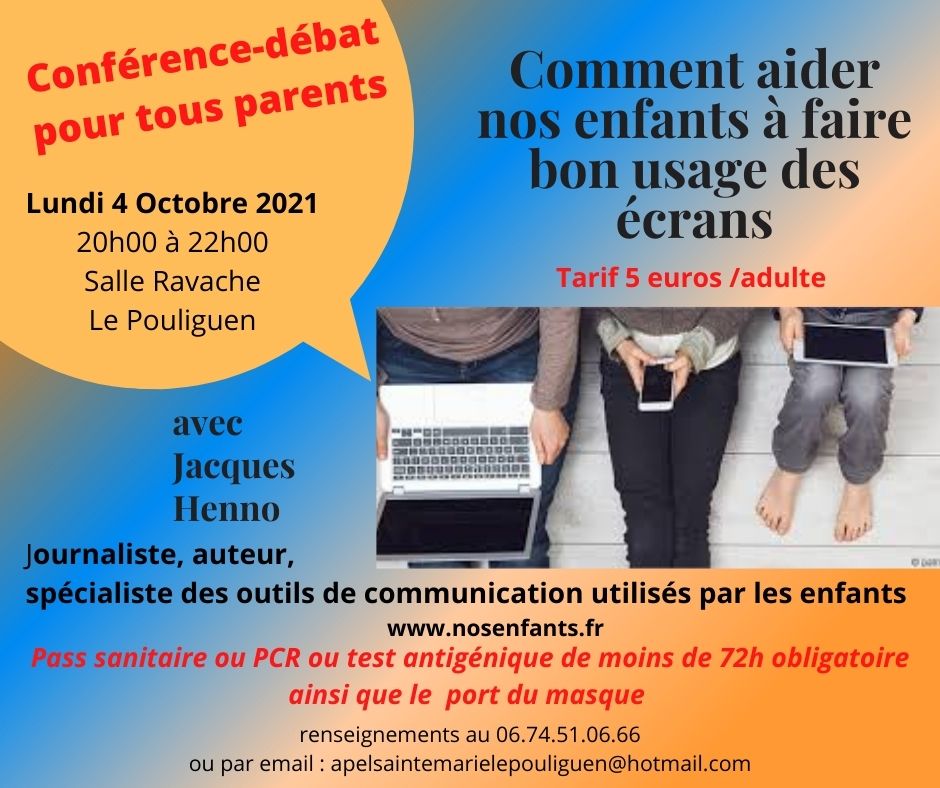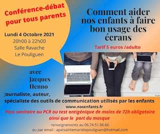 Lundi 5 octobre 2021 au Pouliguen (44) pour parler de « Comment aider nos enfants à faire bon usage des écrans »